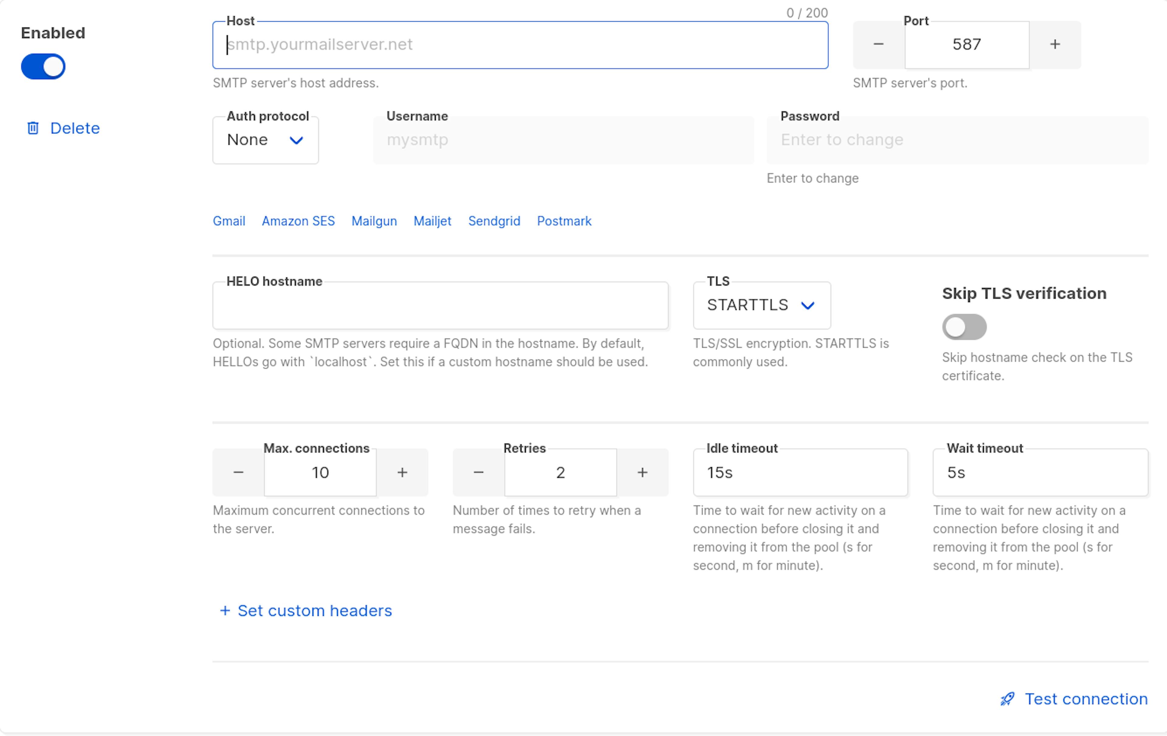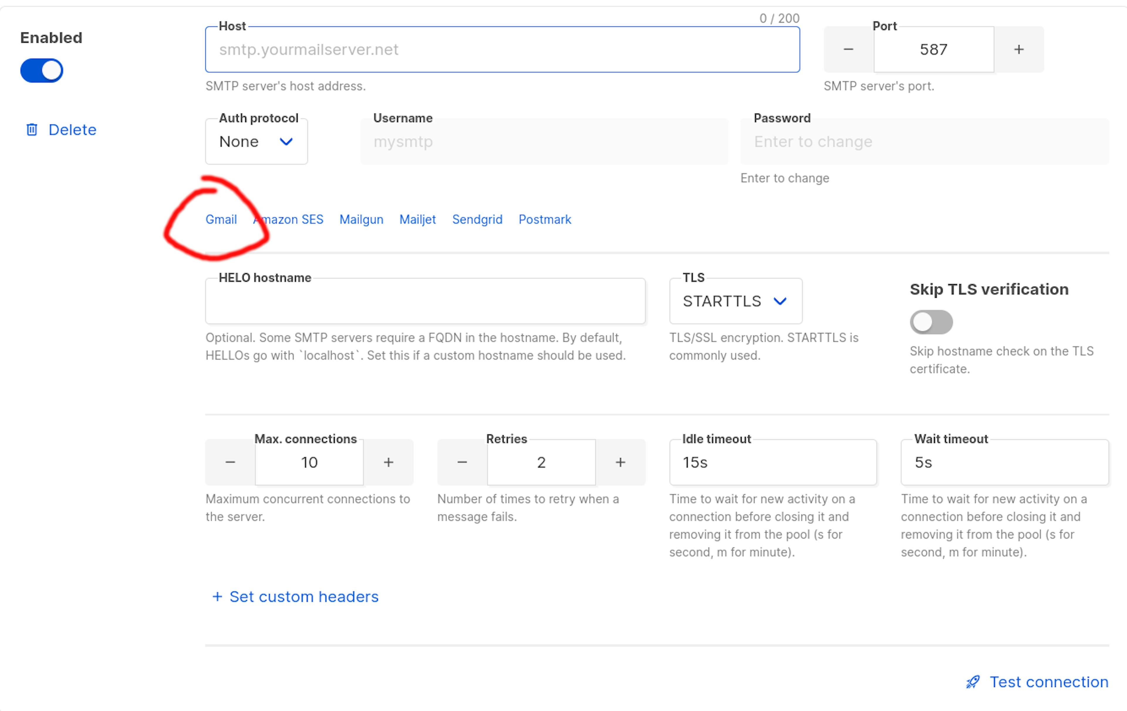 Į SMTP skirtuke, nustatymuose rasite tai: