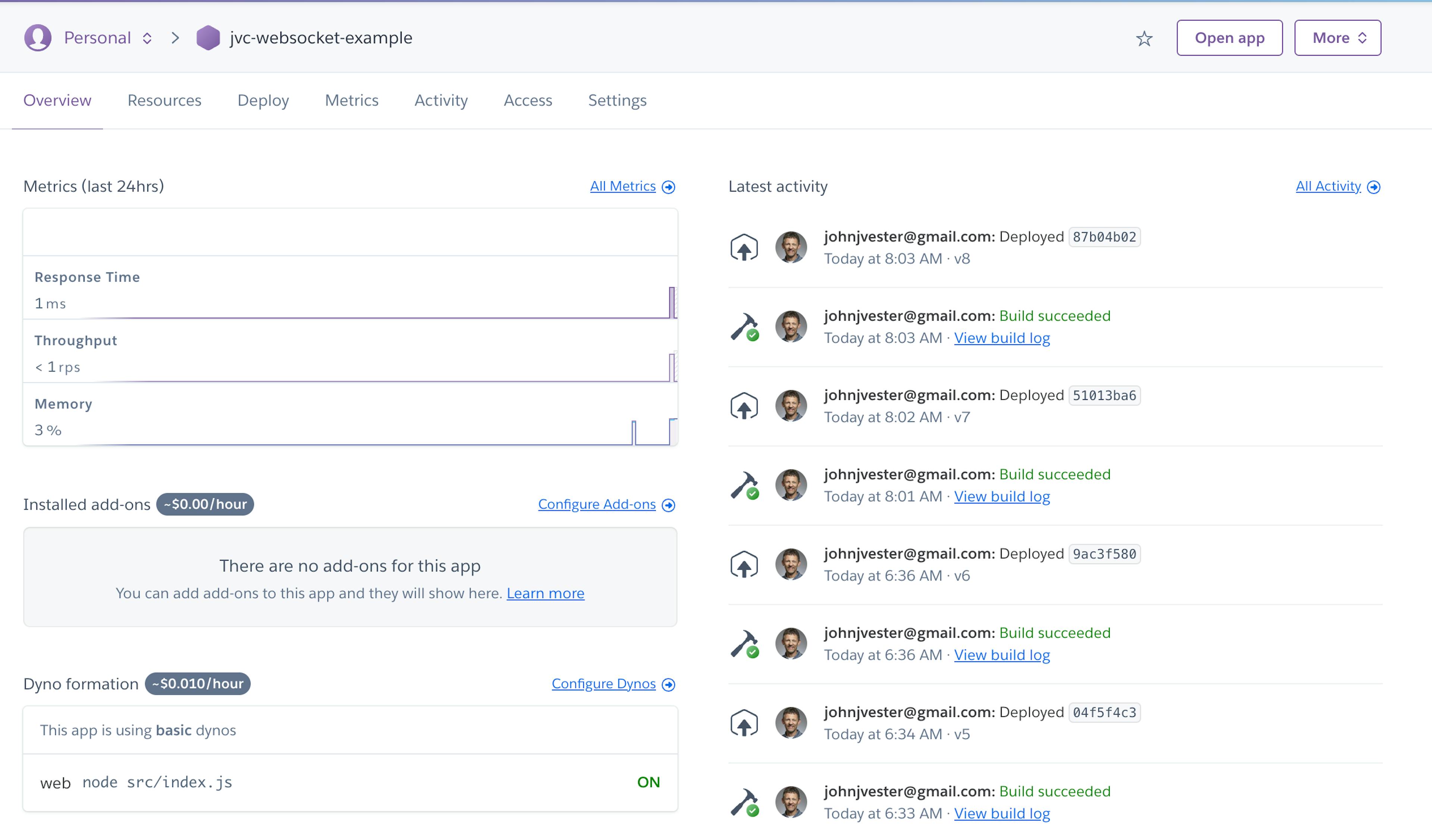Kai WebSocket klientas paleidžiamas, jo būseną galime pamatyti Heroku prietaisų skydelyje: