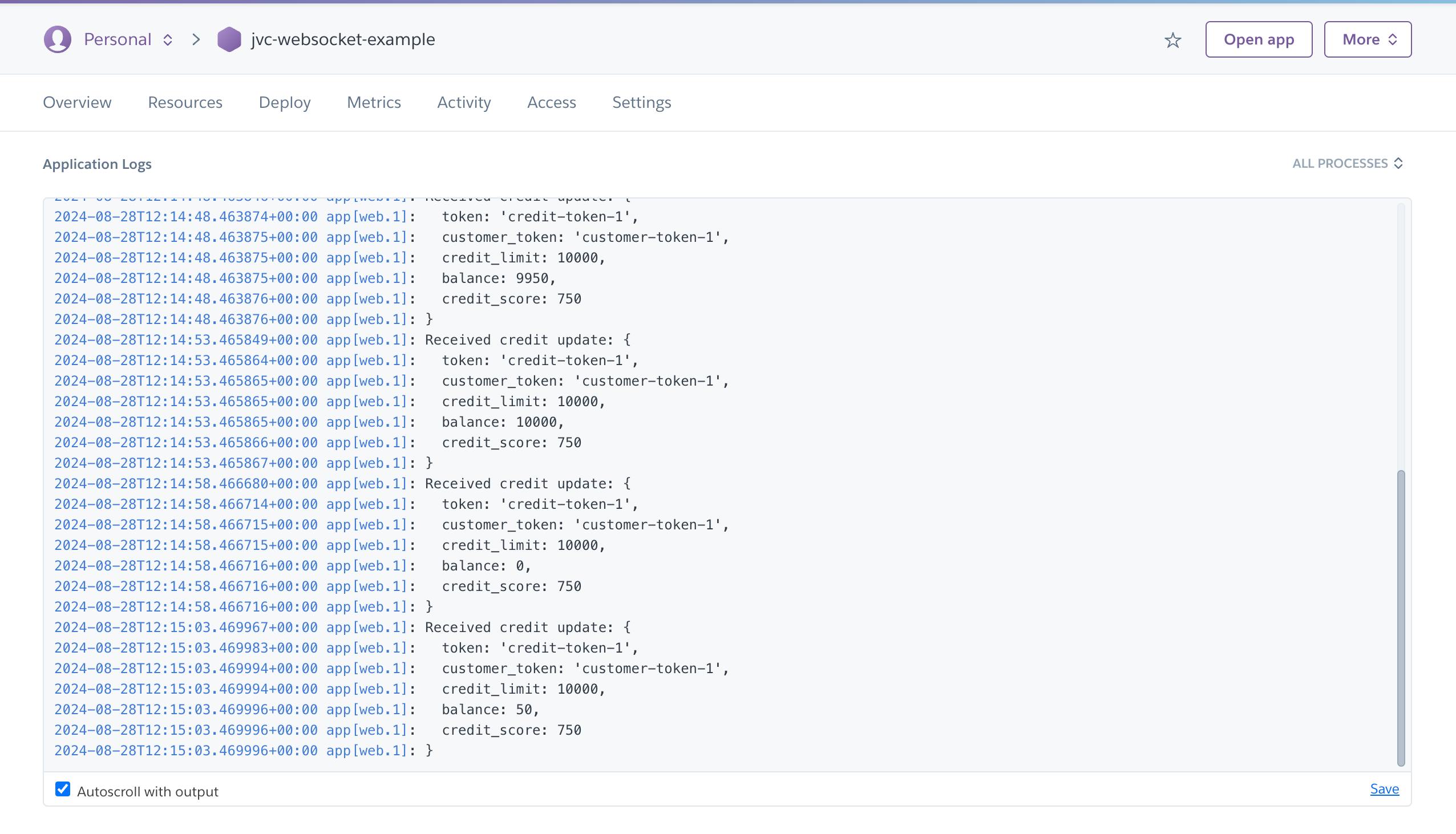 Peržiūrėdami žurnalus „Heroku“ prietaisų skydelyje jvc-websocket-example Pavyzdžiui, galime matyti kelis atnaujinimus balance nuosavybė jvc-graphql-server-sub paslauga. Savo demonstracijoje netgi galėjau užfiksuoti naudojimo atvejį, kai likutis buvo sumažintas iki nulio, imituojant, kad buvo atliktas mokėjimas:
