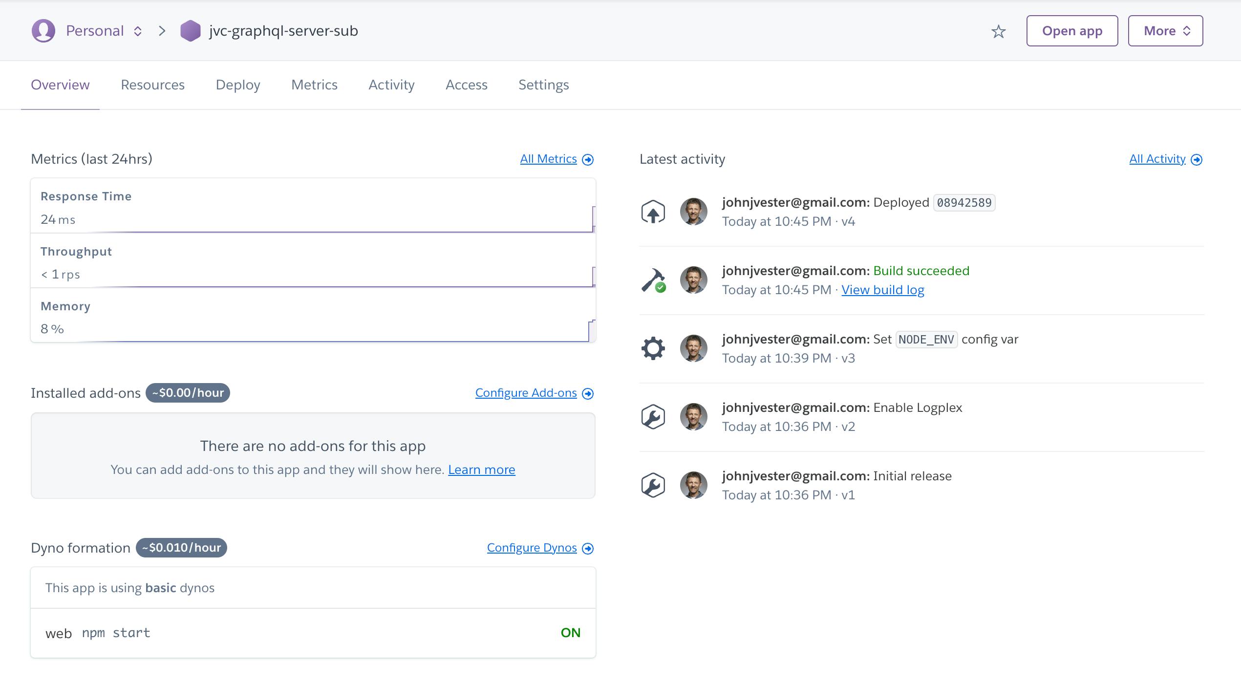 Greitas „Heroku“ prietaisų skydelio vaizdas parodė, kad mano „Apollo“ serveris veikia be jokių problemų: