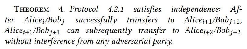 5 teorema. 4.2.2 protokolas patenkina izoliaciją: Alisa ir Bobas gali vienu metu ir atskirai perkelti savo pozicijas atitinkamai Carol ir Dave. Tai reiškia, kad perduodantis turėtojas ir perduodantis rašytojas gali tęstis vienu metu.