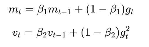 Adomas palaiko slankiuosius gradientų (mt) ir kvadratinių gradientų (vt) vidurkius, kad pritaikytų mokymosi greitį kiekvienam parametrui: