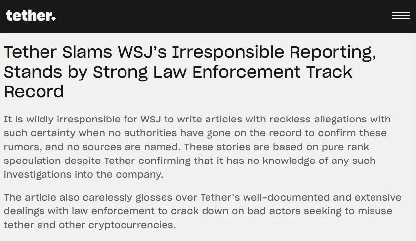 USDT drama: „Tether Labels“ WSJ US Probe teigia, kad „neatsakingas pranešimas“