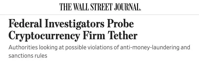 „Wall Street Journal“ paskelbė __straipsnį __, kuriame teigiama, kad JAV pradėjo tyrimą prieš Tether, populiariausio pasaulyje stabilaus monetų USDT leidėją.